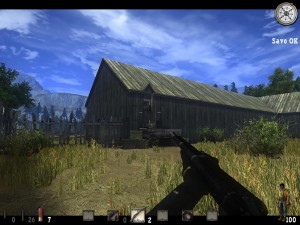 Ve stodole vyšplhejte nahoru,dírou ve střeše se vytáhněte nahoru a skočte na další střechu.