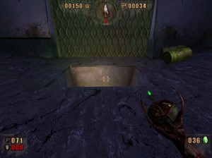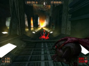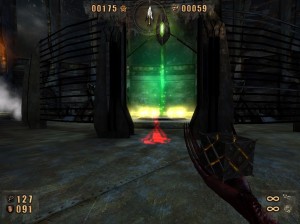 /kterým projděte.Zabijte další kvanta nepřátel a projděte checkpointem, vzadu vlevo.Vejdete do žlutě svítícího portálu.Projděte jím a ocitnete se v další otevřené aréně.Zabijte vše včetně dvou kulturistů na konci a pak se vám uprostřed portálu objeví zelený paprsek.Projděte paprskem/portálem/,tím se vrátíte zase zpátky.Pobijte další várku nepřátel a až vše vyčistíte od havěti tak se vám u portálu se zeleným paprskem objeví checkpoint./viz obrázek